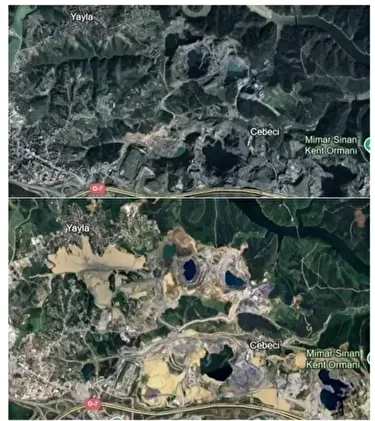İstanbul Büyükşehir Belediye Başkanlığı görevinden uzaklaştırılarak tutuklanan Ekrem İmamoğlu hakkında kurduğu suç örgütü ile yolsuzluk yapıldığı iddiasıyla hazırlanan iddianamenin detayları ortaya çıkmaya devam ediyor. İddianamede, gözle görülecek şekilde orman alanlarının tahrip edildiği ve maden alanlarının zarar gördüğü fotoğraflarla karşılaştırıldı.